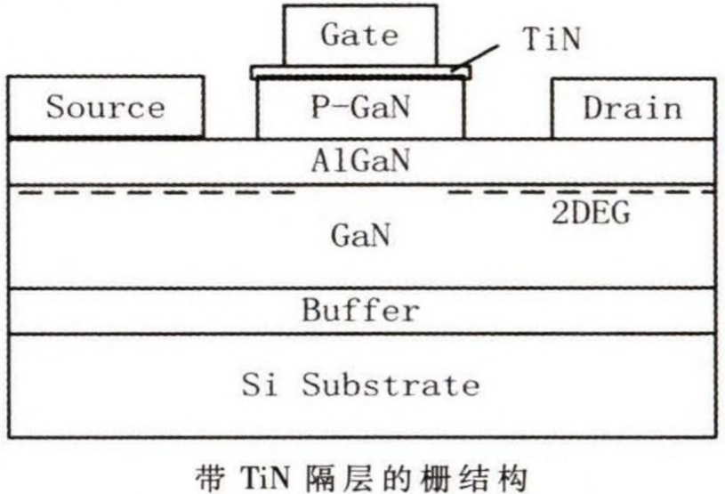 文献[3]在P型栅结构的基础上,采用在P-GaN层上沉积TiN金属,形成三层掩膜的栅极结构,从而实现肖特基接触,如图3所示。这种结构存在栅极场板,可增加高压应用场板设计的灵活性。实验证明,这种结构具有低栅极电阻、降低高漏源电压VDS时的导通电阻RDS-ON等优势,且相比采用欧姆接触的P-GaN结构,此结构降低了栅极漏电流。
