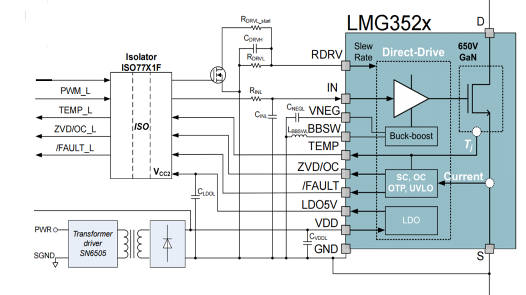 TI为代表的内部使用芯片集成buck-boost及保护功能需要输出特定信号,共计需要13阻容、二极管等元件,外围器件较多,需要匹配TI专用的隔离驱动器,ISO77X1F系列,可以处理芯片的特殊信号。这种方式的直驱同样是适用于高频应用,有IC的加持芯片的稳定性更高,但是设计复杂。