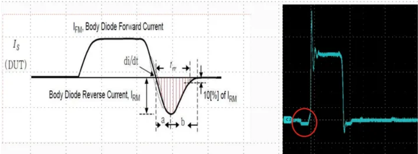 反向恢复时间trr & 反向恢复电荷Qrr:由于内部寄生二极管可视为一种电容器,所以寄生二极管从导通切换到关断状态会储存少量电荷(下图红色区域即为Qrr),而电荷量完全释放出需耗费一段时间,此时间就是trr。