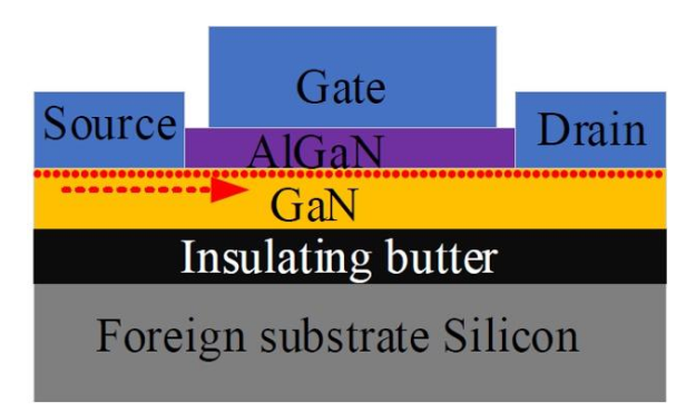 耗尽型GaN HEMT的器件结构如图1所示。耗尽型GaN HEMT采用Si材料作为GaN HEMT的基片,在Si基片基础上生长出高阻性的GaN晶体层,即氮化镓通道层(GaN channel)。一般在GaN层和Si衬底层之间添加氮化铝(AIN)绝缘层作为氮化镓缓冲层(GaN buffer),将器件和衬底隔离开来。AlGaN层存在GaN层和栅极(G)、源极(S)和漏极(D)之间;AlGaN层和GaN层之间可以产生具有高电子迁移率、低电阻特性的二维电子气(Two-Dimensional Electron Gas,2DEG),且它的浓度随AlGaN厚度先线性增加,然后达到饱和。
