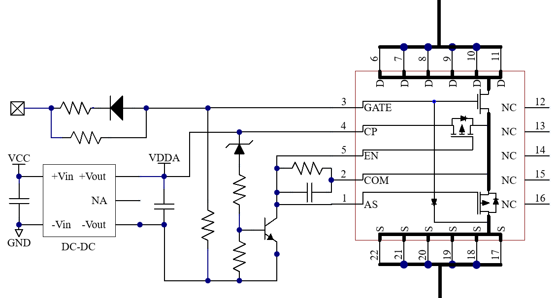 外围配置滤波、系统电源电压检测等功能,最低配置电容*2+电阻*6+Zener+diode共10颗元件,6种功能引脚,除G、D、S外,还有使能、电源、启动、开尔文S等引脚,可以兼容常规的MOS驱动器,外部需要增加低压检测电路。相对于cascode,这种直驱方式损耗小适用的频率更高。