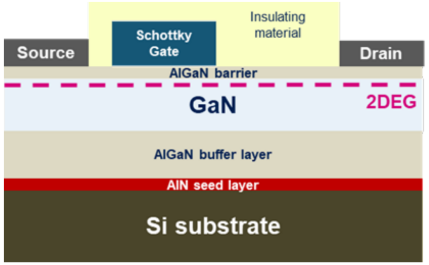 与Si传统器件不同,耗尽型GaN HEMT由于氮化物极强的极化效应,AlGaN/GaN异质结可以通过自发极化和压电极化效应在其界面形成很高浓度2DEG导电沟道,在零栅压下,器件处于导通状态。因此往往需要负压关断。耗尽型GaN HEMT不同于Si MOSHEMT的是,由于其栅极下方不存在与S极连接的P型寄生双极性区,因此没有寄生体二极管,故而器件开关损耗小、具有对称的传导特性。因此GaN HEMT可由正栅源电压VGS或正栅漏电压VGD驱动。
